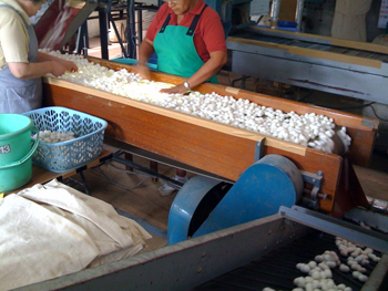 ![]() 碓氷製糸:繭の仕分け作業でしょうか ![]() 碓氷製糸:繭から糸を取る工程です |
