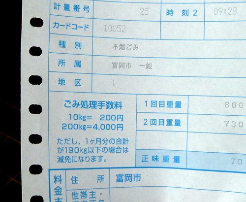| 6月11日(月)その1 ★午前中は、清掃センターへ、ごみの搬入に行ってきました。 清掃センターといえば、今年の初めに、複数の市民の方から、ごみ処理手数料について『190kgまでは無料で、200kgを超えると、いきなり4000円というのはどういうことなのでしょうか?』とのお問い合わせを頂いたことがあります。 手数料についての情報が、市民のみなさんへ十分に周知されていなかったことが原因と思われましたので、さらに分かりやすくしていただけますよう清掃センターにはお願いしていましたが、今日頂きました伝票では、早速それが改善され、手数料についての説明が記されてありました。 ![]() 頂いた伝票に、このような説明があれば、非常に分かりやすいと思います。 改善していただきまして、ありがとうございました。 |