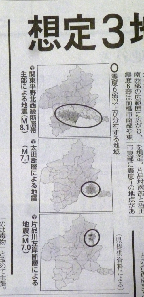 | 6月26日(火)その1 ★本日の朝刊に、県が公表した地震被害想定の記事が出ています。 が… M8.1が予想されている関東平野北西縁断層帯主部の地震の発生確率(30年以内)は、『ほぼゼロ』。 ならば、わざわざ不安を煽るようなことはしなくてもよいようにも思えますが? 冬の午前5時に発生すれば、富岡市での被害は 『死者224人・負傷者761人・全壊建物5353棟・半壊建物9131棟』と、詳細な予想が出ていますが、これはどのような方法で計算していくと、この数値になるのでしょうか? まさか、防災対策の公共事業を行うための理由作りではないのでしょうが… |